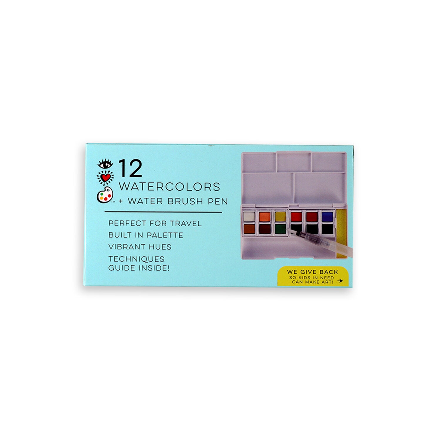 Compact-sized plastic case includes a built-in palette, 12 rich concentrated watercolor cakes, cleaning sponge, and medium-sized water brush pen.